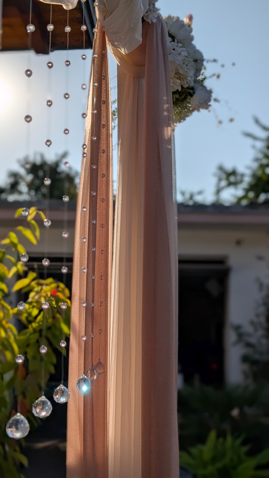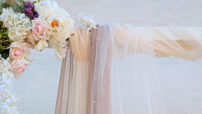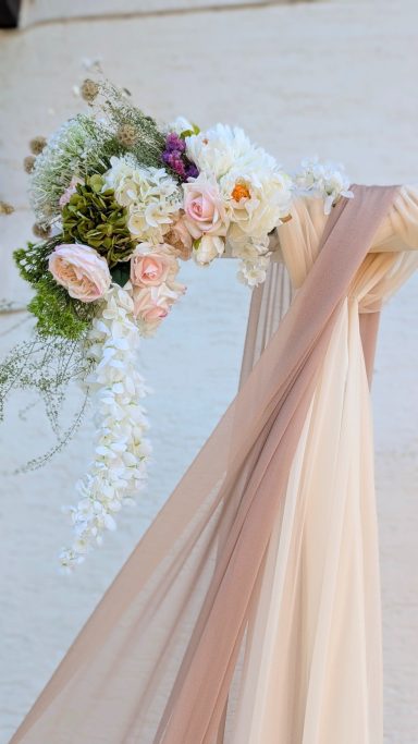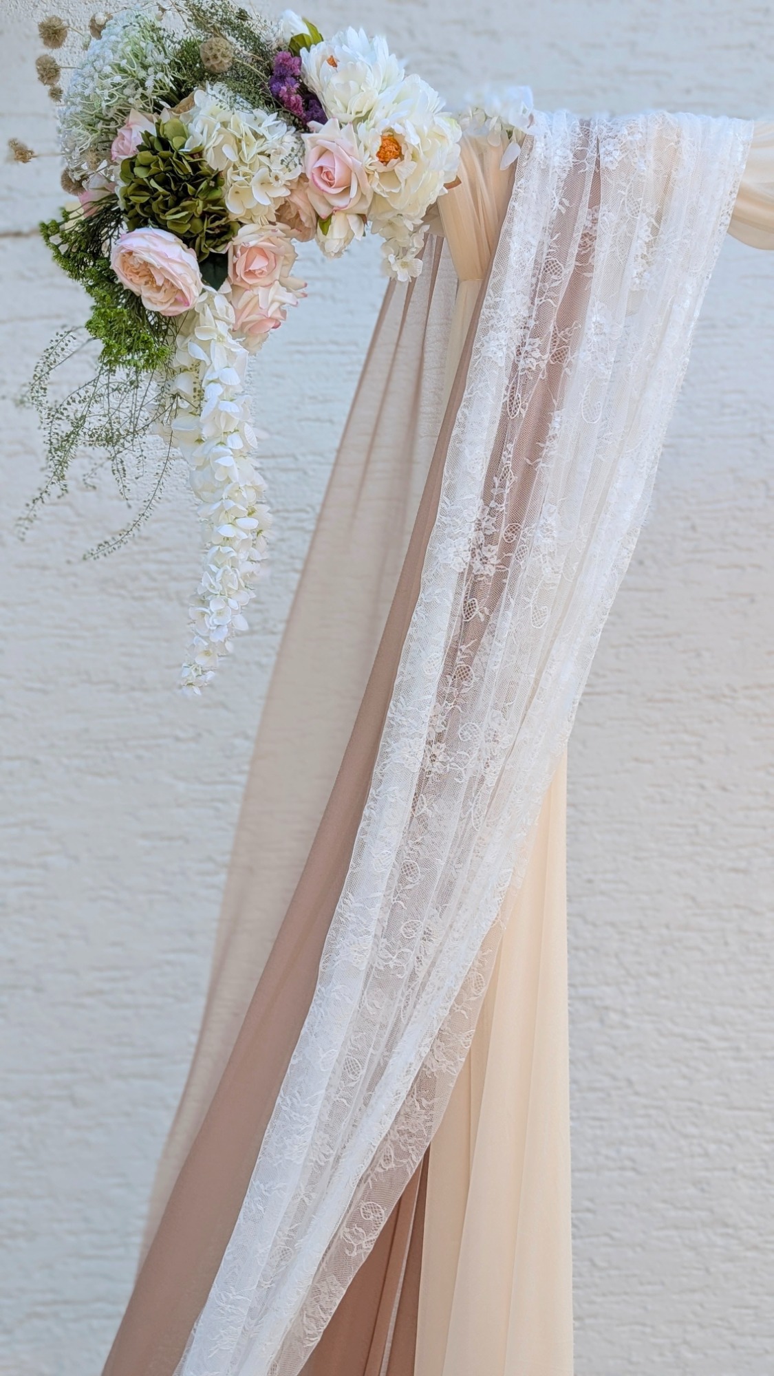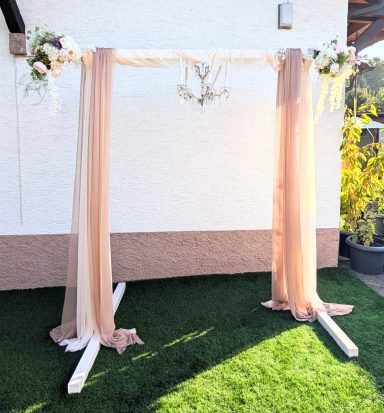 Unser Traubogen ist für euch in verschiedenen Ausstattungen mietbar: Ohne jede Dekoration, mit Tuchen in Weiss, Creme und/oder Champagner, Perlenbestickt oder mit Spitze. Mit Kunst und Trockenblumen-Schmuck, mit Kristallen oder Kronleuchter mit LED-Kerzen. Oder allem gleichzeitig. Ganz wie ihr wollt!