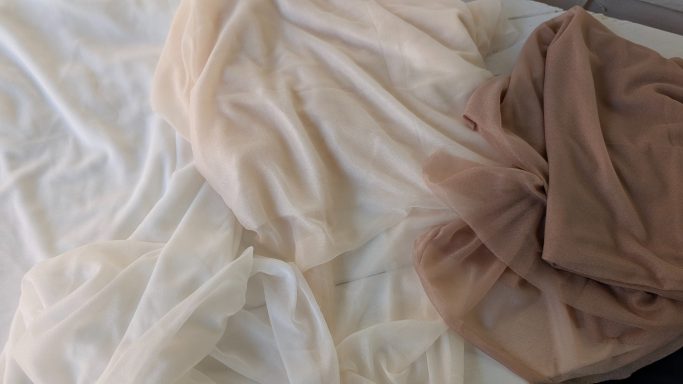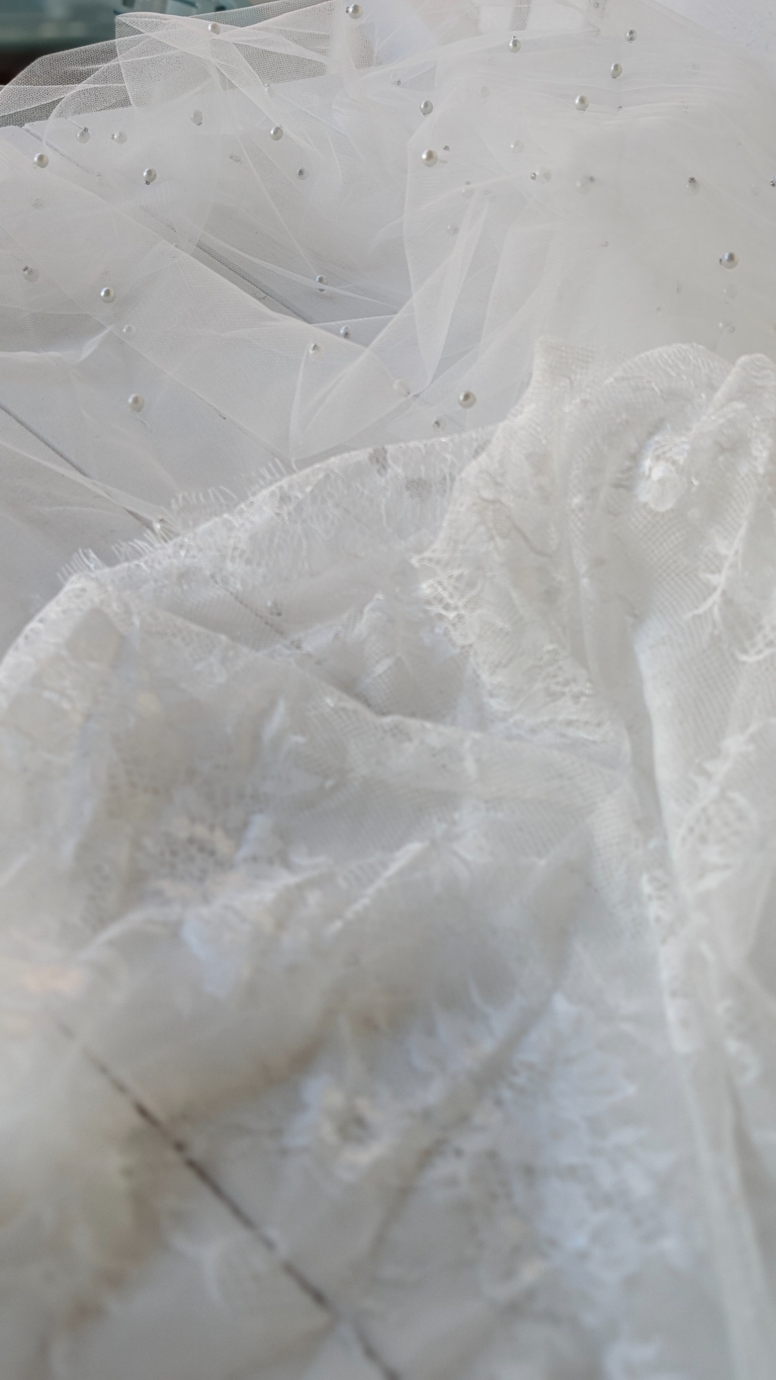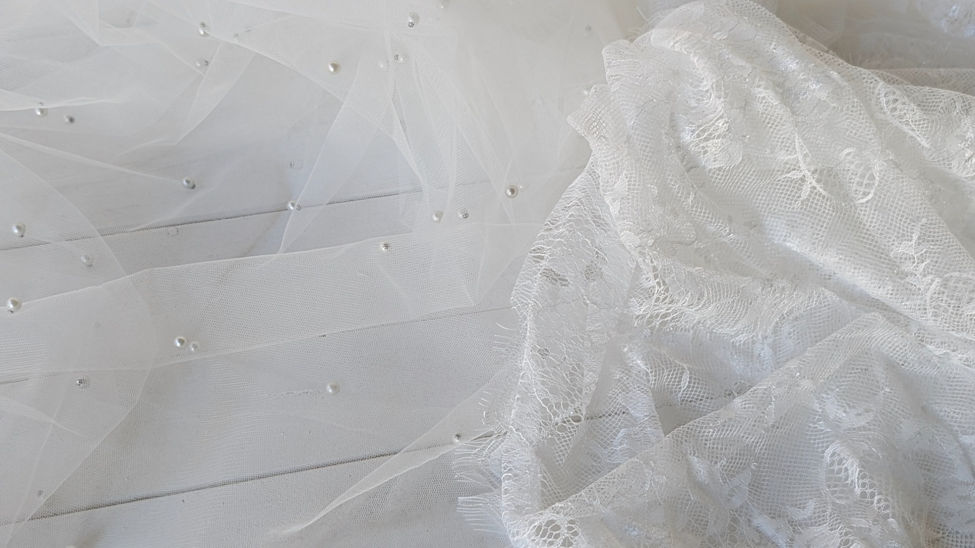 Anzahl und Größe des perlenbestickten Tülls: Viermal vorhanden. Jeweilige Maße: 80x200cm.
