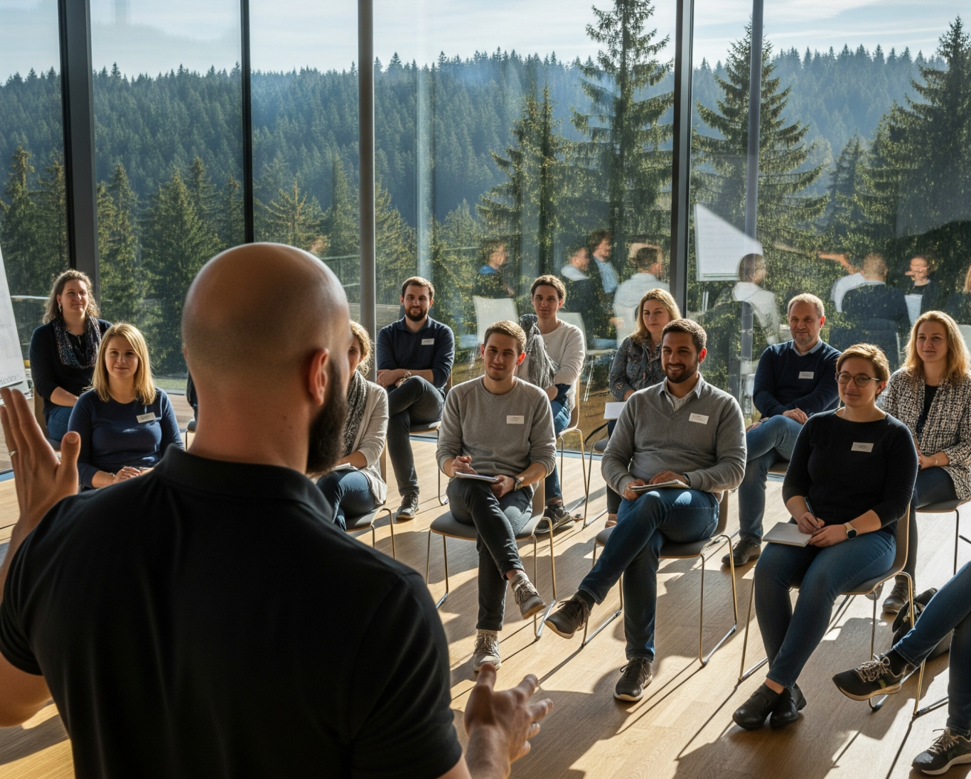 Je nach Anzahl der Teilnehmenden in diversen Räumlichkeiten möglich. Mit bis zu 40 Personen mit eigener Soundanlage möglich, auf Bühne und in großen Sälen wird die Veranstaltungstechnik vor Ort benötigt (Beamer und Soundanlage mit Mikrofon).